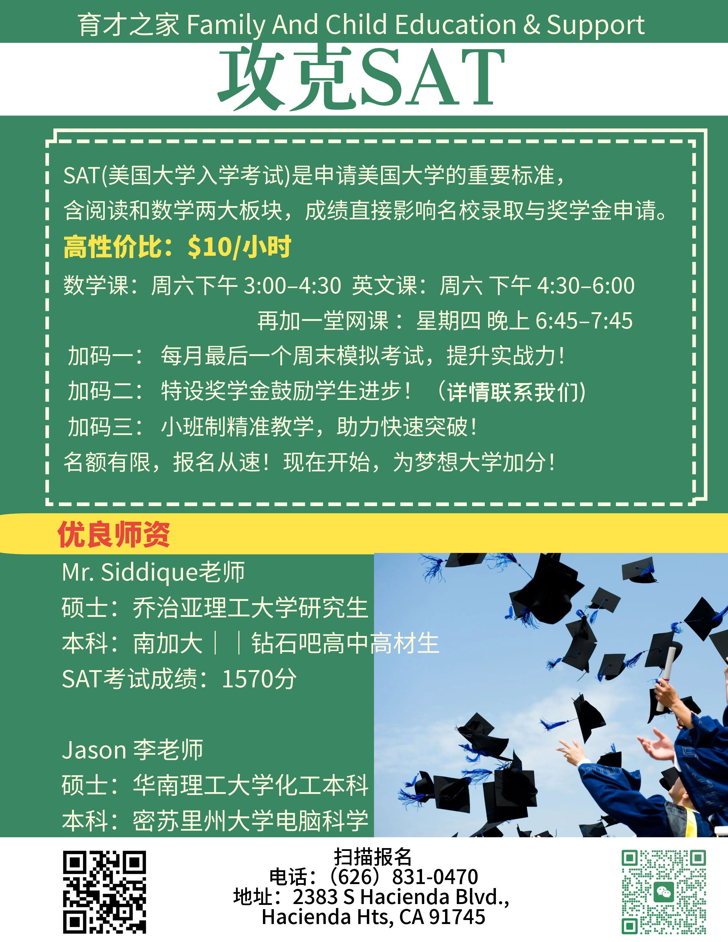 SAT 是申请美国大学的重要指标。我们的课程涵盖阅读与数学两大板块, 专注技巧与实战演练。每季度三个月仅 $360(约 $120/月),平均每月 20 小时专业辅导,性价比超高。